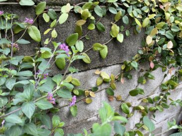 A few years ago, it dawned on me that I could plant Wandering Fig in the upper bed and train it to grow down the wall. It’s been a slow process, but to my great delight the tendrils seem to have established themselves this year, and they are beginning to spread out over the unclaimed real estate that is my CMU wall!